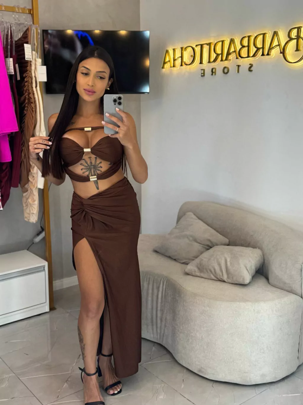 O cropped possui três possibilidades de amarração e detalhes em aviamentos dourados, enquanto a saia conta com um nó charmoso e uma super fenda lateral que vai fazer você brilhar!